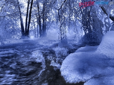 Puzzle Ośnieżone, Rzeka, Lód, Drzewa