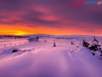 Zima, Drzewka, Ogrodzenie, Zachód słońca, Domek, Norwegia, Drewniany, Ośnieżone