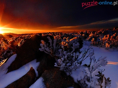 Puzzle Ośnieżone, Zachód Słońca, Skały, Gałązki