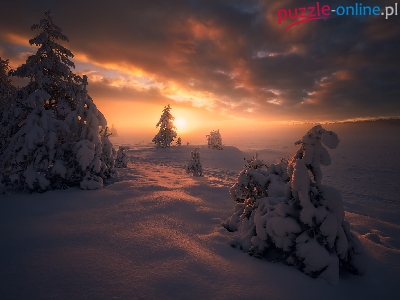 Ośnieżone, Świerki, Zima, Zachód słońca, Drzewa
