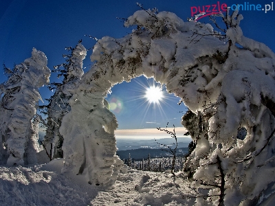 Puzzle Ośnieżone, Niebo, Słońce, Drzewa