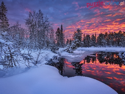 Chmury, Jezioro, Zima, Ośnieżone, Zachód słońca, Drzewa