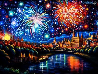 Oświetlone, Miasto, Nowy Rok, Noc, Domy, Fajerwerki, Grafika, Rzeka, Kolorowe