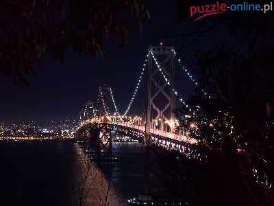 Rzeka, Oświetlony, Noc, San Francisco, Most Bay, Drzewa