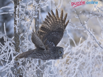 Puszczyk mszarny, Zima, Sowa, Gałęzie, Lecąca, Ptak, Oszronione
