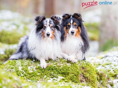 Owczarki szetlandzkie, Śnieg, Dwa, Psy, Mech
