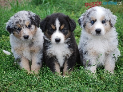 Puzzle Owczarki Australijskie, Trzy, Szczeniaki, Trawa