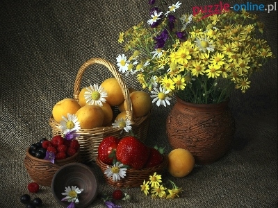 Owoce, Truskawki, Kwiaty, Kosz, Morele
