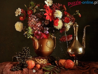 Owoce, Dzbanek, Bukiet, Kwiatów, Miedziany