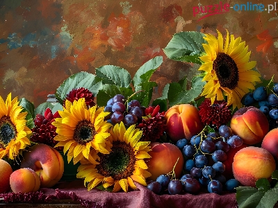 Stół, Grafika, Winogrona, Słoneczniki, Dalie, Brzoskwinie, Kwiaty, Owoce
