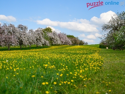 Puzzle Drzewa owocowe, Wiosna, Łąka, Mlecze