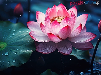 Wody, Grafika, Krople, Rozkwitnięty, Lotos, Liście, Kwiat, Pąki
