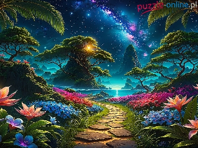 Palmy, Kwiaty, Drzewa, Ścieżka, Kamienna, Droga Mleczna, Grafika, Niebo
