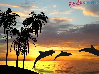 Palmy, Słońca, Delfiny, Morze, Zachód