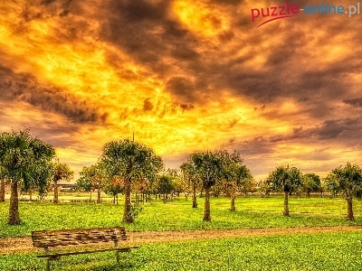 Palmy, Ławka, Zachód, Słońca, Park
