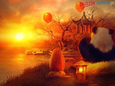 Panda, Dziewczynka, Słońca, Mała, Miś, Zachód