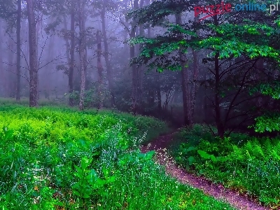Paprocie, Drzewa, Wiosna, Las, Ścieżka, Mgła