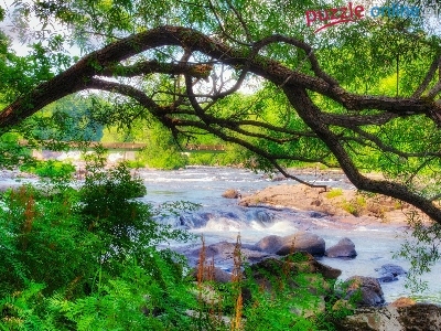 Paprocie, Wiosna, Rzeka, Kamienie, Most