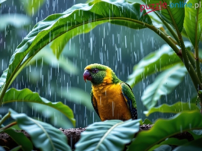 Zielono-żółta, Liście, Papuga, Grafika AI, Deszcz