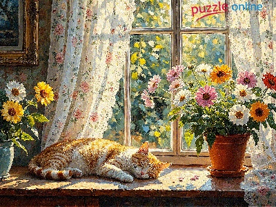 Doniczka, Wazon, Kwiaty, Śpiący, Kot, Okno, Rudy, Parapet
