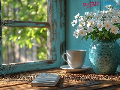 Wazon, Okno, Niebieski, Parapet, Białe, Kwiaty, Filiżanka