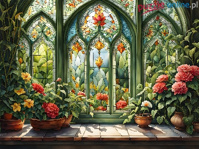 Witraże, Doniczki, Kwiaty, Parapet, 2D, Okno