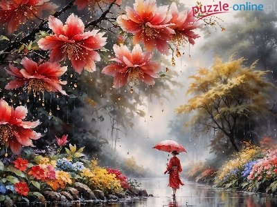 Drzewo, Grafika, Kwiaty, Parasol, Droga, Deszcz, Kobieta