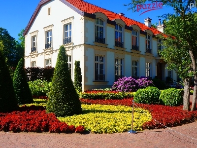 Park Oliwski im. Adama Mickiewicza, Gdańsk, Alejka, Ścieżka, Rośliny, Dworek, Polska, Budynek, Kwiaty