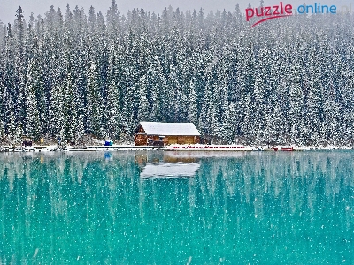 Jezioro, Dom, Zima, Drzewa, Louise Lake, Alberta, Kanada, Las, Park Narodowy Banff
