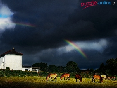 Puzzle Pastwisko, Konie, Tęcza, Budynek