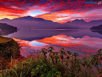 Góry, Piękny, Słońca, Chmury, Jezioro, Roślinność, Zachód