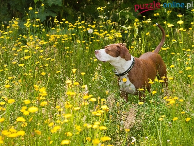 Puzzle Żółte, Łąka, Pies, Kwiaty