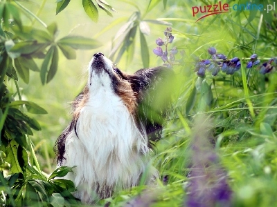 Puzzle Łąka, Bearded Collie, Pies, Kwiaty