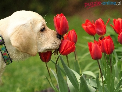 Puzzle Czerwone, Pies, Tulipany