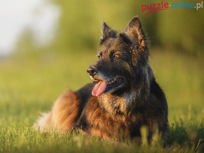 Leżący, Owczarek niemiecki, Pies, Trawa, Język