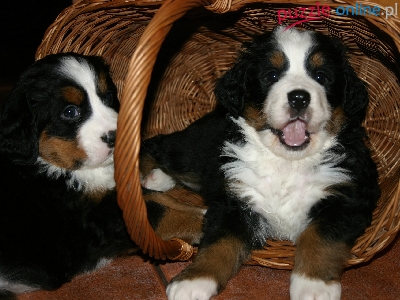 Berneński pies pasterski, słodkie, wiklinowy, dwa, szczeniaki, koszyk