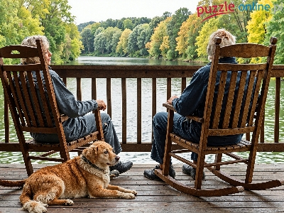 Taras, Mężczyzna, Kobieta, Pies, Rzeka, Krzesła