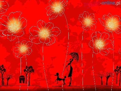Pies, Kwiaty, Kobieta, Parasol, Drzewa
