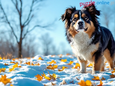 Żółte, Zima, Grafika, Pies, Liście, Śnieg