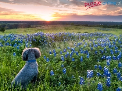 Pies, Słońca, Łąka, Łubin, Zachód