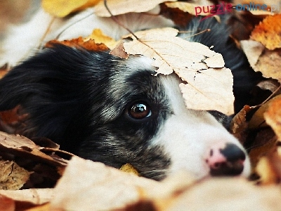 Puzzle Liście, Piesek, Spojrzenie, Bearded collie
