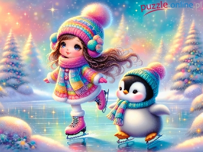 Łyżwy, Dziewczynka, Zima, Pingwin, Grafika, Lód