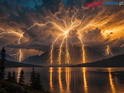 Drzewa, Burza, Jezioro, Pioruny, Chmury, Grafika AI