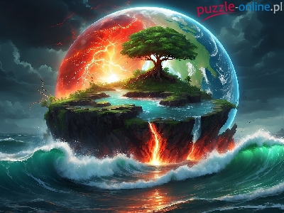 Drzewo, Fantasy, Wyspa, Pioruny, Planeta, Morze, Ogień