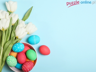 Kolorowe, Wielkanoc, Bukiet, Niebieskie tło, Tulipany, Białe, Pisanki