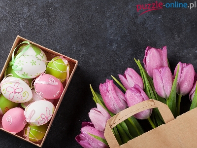 Pudełko, Torba, Tulipany, Ciemne tło, Fioletowe, Papierowa, Pisanki