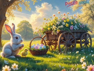 Kwiaty, Łąka, Wóz, Królik, Kurczak, Koszyk, Wielkanoc, Pisanki