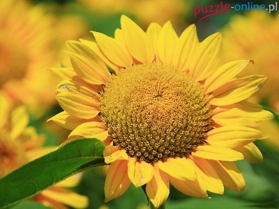 Płatki, Liść, Słoneczniki, Żółte, Zielony