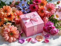 Prezent, Kwiaty, Kolorowe, Płatki, Kokarda, Pudełko