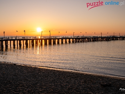 Gdynia, Morze Bałtyckie, Zachód słońca, Molo, Polska, Plaża